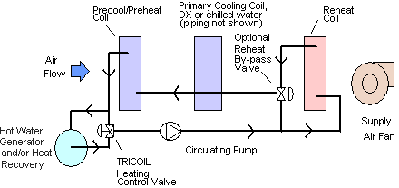 The TRICOIL® method uses a simple hydronic recuperative heat exchange process (often referred to as a "wrap-around" loop) in combination with a supplemental heat source. This combination accommodates a variety of control strategies that enhances indoor air quality and optimizes energy efficiency. Some features of the method are: